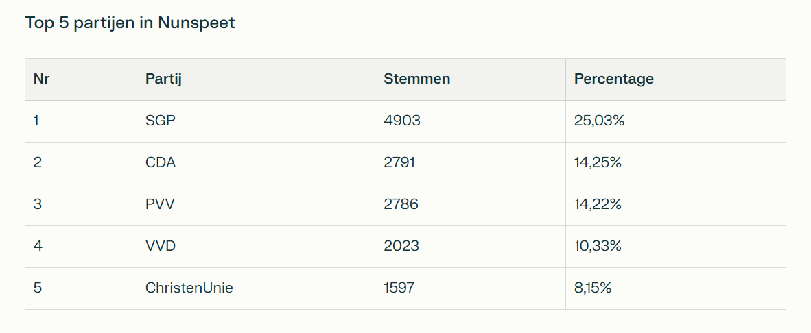 1. SGP (Staatkundig Gereformeerde Partij): De SGP is traditioneel sterk in Nunspeet en kreeg dit jaar ruim een kwart (25,03%, 4903 stemmen) van alle stemmen. Veel kiezers waarderen de stabiele en christelijk-conservatieve koers, zoals meer aandacht voor het gezin, bescherming van kwetsbaar leven, geen drugs en pornografie en een vaste wijkagent in elk dorp. Lijsttrekker was Chris Stoffer en het programma ‘Stem Christelijk voor Nederland’ benadrukt continuïteit en familiewaarden.